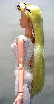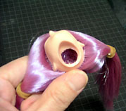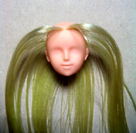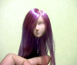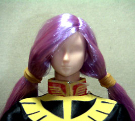 ゲリン少尉に続いて、お次はガルマ様のヘッドといきましょう! 少尉ヘッドと同じくショップ探索の結果、ガルマ様用ヘッドとして選んだのは『オビツ02番ヘッド』です。 オビツの02番というのはもともと女性素体用のヘッドなのですが、市販されている男性素体用のヘッドというのはリアル系(G.Iジョーみたいな)か、美形チックな物でも頭の形がどうも面長に作られています。 で、ガルマ様の頭特有の『丸いシェイプ』&『キリリとした顔立ち』に最も近いものを探したら、コレになってしまいました。 しかもラッキーなことに、オビツ02番には『パープルヘアー植毛済み』のヘッドが売られているのです!(喜) というわけでお買い上げしてきたのですが・・・ このヘッドにはラッキーばかりでなく問題が2つほどあります。 まず最大の問題は、このままではオビツの男性素体の首にくっつかない、、、ということです。 はい、ジョイント径も形状もまるで違うのです。(泣) これは後でなんとか改造してみるしかありません。(できるかな?) つぎに、オビツの植毛済みヘッドは全て『センターパート(真ん中分け)』で植毛されているのですが、ご存じのとおり、ガルマ様ヘアーは『左サイドパート』なんですな、これが。 したがって、ちょっと手を加えなければならない状況です。 この写真は、真ん中分けに植毛されたヘアーを櫛(くし)で無理やり横分けにしてみたところです。 サイドパート用の植毛がなされてないので、分け目の部分の『地肌』が丸見え状態です・・・(^^;) これではカッコ悪いので、地肌を隠して新たな分け目をつくるための植毛をしなくてはなりません。 植毛用に使用するヘアーとして、同じパープルの『ノアドロームの9番』ヘアーを買いました。 実はこの9番ヘアーなんですが、オビツヘッドにもともと植毛されているヘアーと同じパープルでも微妙に色が違います。 ノアドの薄紫はオビツのパープルよりちょっとだけ青っぽくて鮮やかな感じかな? ぱっと見ただけでは解らないのですが、よぉ〜く比べてみるとわかります。 (私はこのノアドの薄紫色のほうがスキです♪) でも、オビツでは植毛用のヘアーのみを売っていないという事情もあり、 分け目用の植毛にいい方の色を使用するので(分け目部分のヘアーがヘアー全体を覆うようになるから)いいかな? ということで、多少色味は違ってもノアド9番での植毛に踏切ることとなりました。 (ヘアーの微妙な色の違い・・・わかるかな? わからないですよね・・・(^^;) (これもゲリン少尉の時と同様、『植えっぱなし』なので髪の根元がおもいっきし立ってます。(笑) さてさて、 こうして2体とも植毛が済んだところで・・・ 次回はヘアスタイルを作っていくことにします♪ |