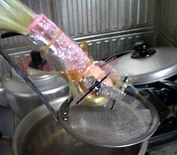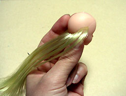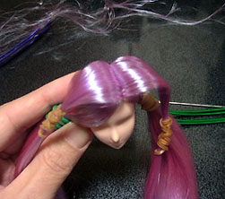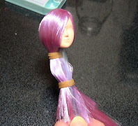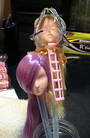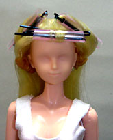 さて、いよいよヘアを整える為の最大の難関、『パーマ』です♪ ドールヘアーの素材には色々な種類があるそうなのですが、 私が使用しているのは『サラン』と言ってサランラップなんかと同じものなのだそうです。 で、熱で変形するその性質を利用して『お湯』でヘアーにクセ付けをするのが一般常識らしいです。 というわけで、わたしもその『お湯パーマ』とやらに挑戦です♪ とりあえず、植えっぱなしで根元が浮いた状態の髪では作業がしにくいので お二方には熱湯シャワーを浴びていただき、半乾きになったところで作業開始です。 パーマ用のロッドは、太めのストローを利用。(笑) なんか天使の輪が光ってるし、サラサラつやつやの超ロングヘアー・・・ 手触りもよくて、後でヘアカットするのがもったいない気がしてきました。(^^;) ガルマ様のほうは、ロッドも使わず至ってシンプルです。(笑) この後、お鍋にお湯を沸かしてヘッド(2つとも)を20分ほどグツグツ煮たのですが・・・ ゲリン少尉のほうは失敗しました。(泣) イメージしたような形になってませんでした〜〜〜。(´_`) で、ゲリン少尉のほうは『巻き方』を変えて再度チャレンジです。 今度はなんとかカタチになりそうなので、このまま自然乾燥するのを待つことにします。 (最低でも2〜3日、1週間くらいは放置しておいたほうがいいそうです。) 仲良く乾燥待ち〜〜〜♪ このまましばらく放置状態が続くので、その間を利用して『やりなおし(ガルマ様制服)』をしましょうかねぇ・・・。(^^;) |