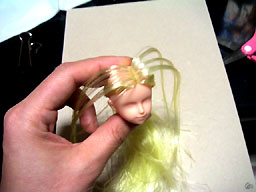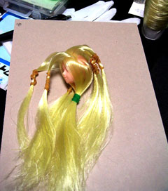 やり直しが決定となったガルマ様のお衣装はさておき・・・ いよいよヘッドの製作です。 購入するヘッド素材を求めて、カスタムドールの代表的なメーカー3社(ノアド・ボークス・オビツ)のショップを足を棒にのようにして回って歩きました。 で、ゲリン少尉のヘッド用に決定したのがノアドの『1番ヘッド』です。 頭の大きさ、顔の輪郭や表情もこのヘッドが最も近いような気がします。 そしてヘアーはというと、これもノアドの33番ヘアーが最もイメージに近い色でした。 この手のカラー(ゴールドというかイエローというか)は全メーカー合わせてもかなりの色数があるのですが、私が選んだ33番はノアドにしかありません。 ボークスにも似たような色がありましたが、微妙にイメージとは違ってました。 ラッキーにもチョイスしたヘッドとヘアーが同じノアド製だったので さっそく『33番植毛済み1番ヘッド』を探したところ・・・ ・・・なんと、在庫切れ!(泣) この手の商品は待っていてもいつ入荷されるかわからないので、植毛済みヘッドの購入はあきらめました。(´_`) 未植毛の1番ヘッドと33番ヘアーを単品でお買い上げし、全植毛にチャレンジです・・・。(汗) (初めてのドール製作での全植毛、成功するのか・・・!?) これがお買い上げのノアド『1番ヘッド』&『33番ヘアー』 ではいよいよ、『初』ドールにして『初』挑戦となる植毛作業開始です。 まず、買ってきたヘアーは洋裁で使うしつけ糸みたいに大きな輪っか状に束ねてあります。 このままでは作業中に絡まってしまうこと請け合い!と考え、トイレットペーパーの芯に巻取ることに・・・(笑) (BGMは『♪い〜と〜まきまき、、、、』で。) 巻き取ったヘアーを30センチぐらいの長さにカットして、ぬいぐるみ用の針に通します。 植えていく順序なんですが、これは人それぞれやり方があるみたいで特に『こうです!』というのは無いようです。 だから私も、やりやすそうなところから毛量のバランスをみつつ植えていくことにしました。 で、1刺しずつスキンヘッドに植えていくのですが・・・ ・・・なんと地道で根気のいる作業なんでしょう(泣) いやいや、ほんっと〜〜に『地道』かつ『根気』のいる作業でした。(^^;) (1週間以上かかったと思われ・・・) 最後の写真、植えっぱなしの状態なので髪の毛の根元が浮いてます。(笑) だから、、このあとヘアースタイルを整えていかなくてわならないのです・・・。 |